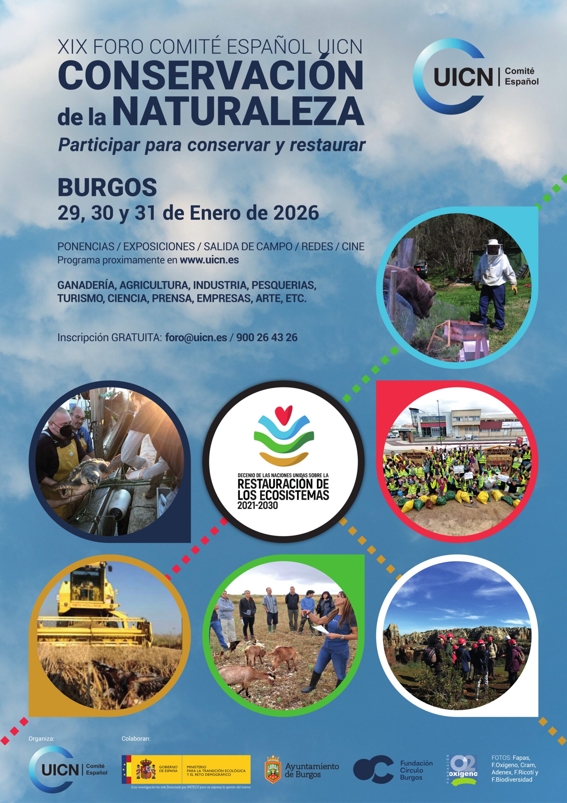El XIX Foro de Conservación de la Naturaleza del Comité Español de la UICN, que se organiza en colaboración con la Fundación Oxígeno, la Fundación Círculo y el Ayuntamiento de Burgos, y con el apoyo del MITECO, reunirá a administraciones públicas, entidades conservacionistas, universidades, empresas y ciudadanía para reflexionar sobre cómo fortalecer la implicación social en la restauración de los ecosistemas.