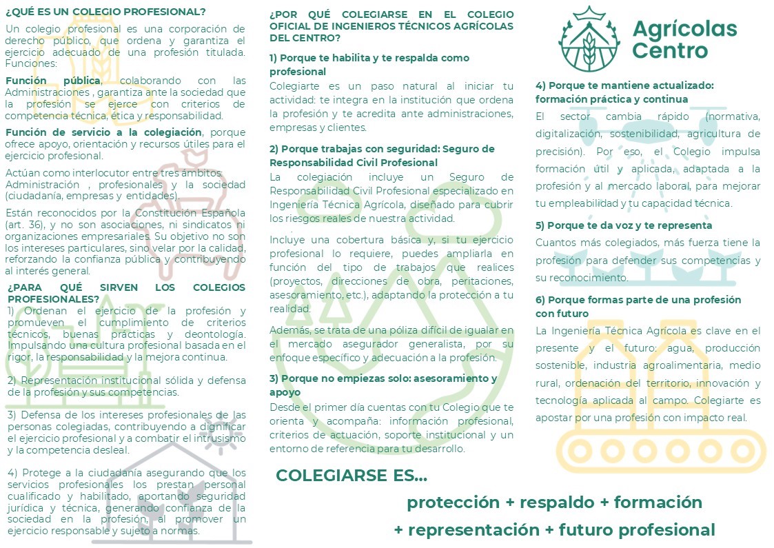 Representante del Colegio Oficial de Ingenieros Técnicos Agrícolas del Centro (CITAC). Explicará el valor del colegio profesional para el ingeniero técnico agrícola en el inicio de su trayectoria profesional y en el ejercicio de la profesión.