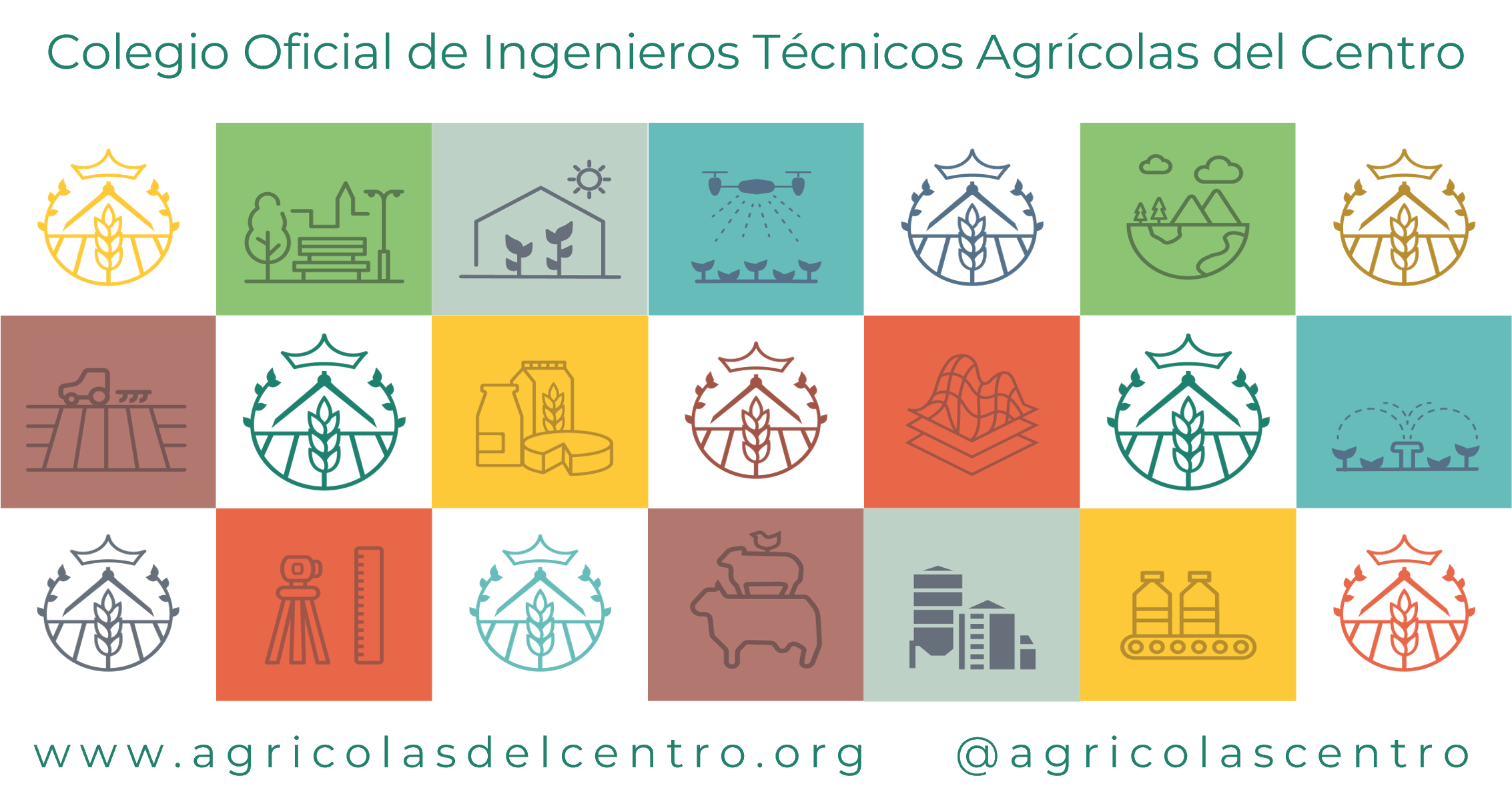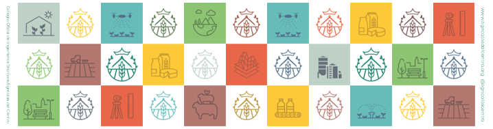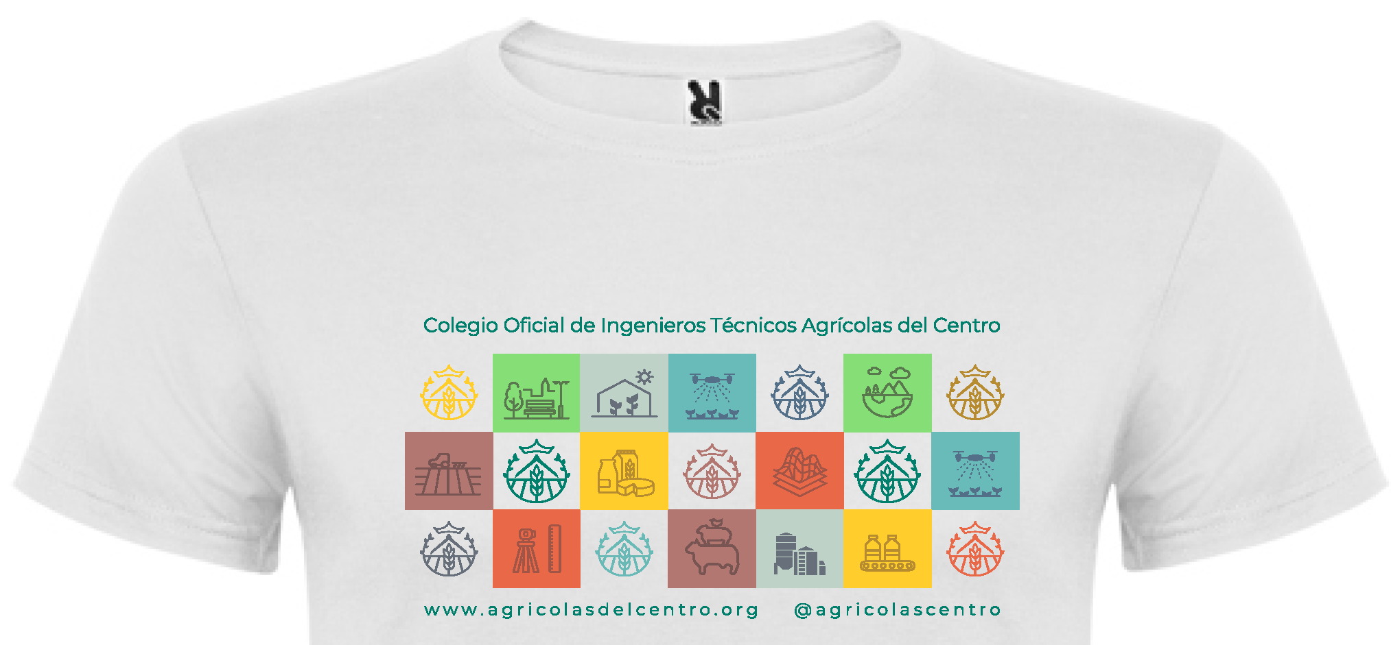 Camiseta de cuello redondo de punto liso 150 gr/m2 de la marca ROLY, hecha de algodón 100 %, en España con la nueva imagen del Colegio con los pictogramas a color de las diferentes ramas del a ingeniería Agrícola.