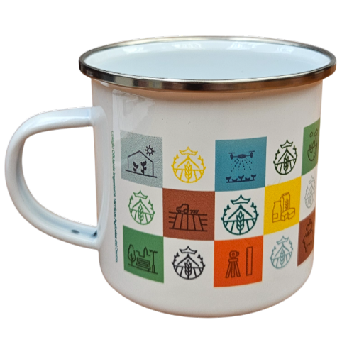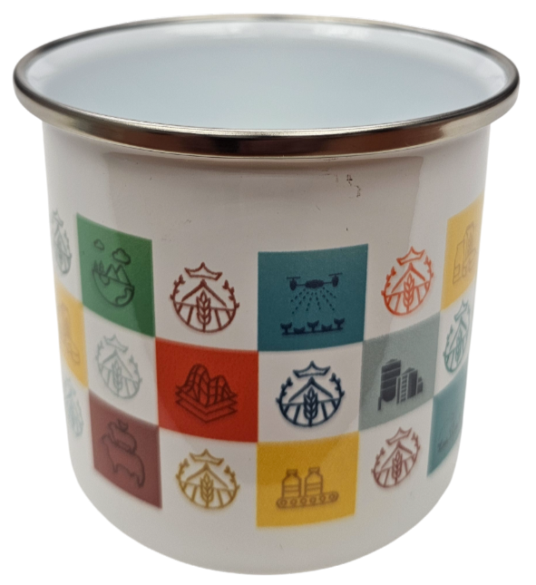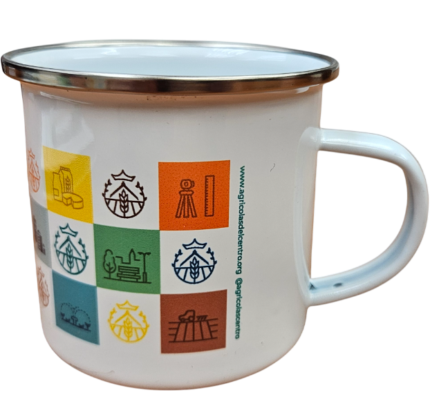 Taza de metal con diseño "retro" con la nueva imagen del Colegio con los pictogramas a color de las diferentes ramas del a Ingeniería Agrícola.