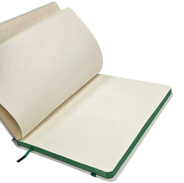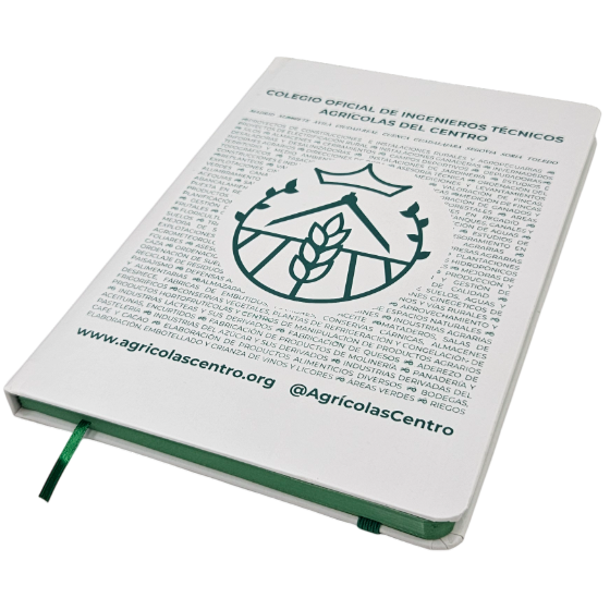 Cuaderno de campo del Colegio Oficial de Ingenieros Técnicos Agrícolas del Centro para usar en el día a día, de tamaño cuartilla, con tapas rígidas de tacto suave y hojas lisas con lomo en color verde. Puedes llevarlo en tus visitas o dejarlo en la oficina. Con cinta marcapáginas para ir directo al grano y una cómoda goma para mantenerlo siempre cerrado en los desplazamientos.