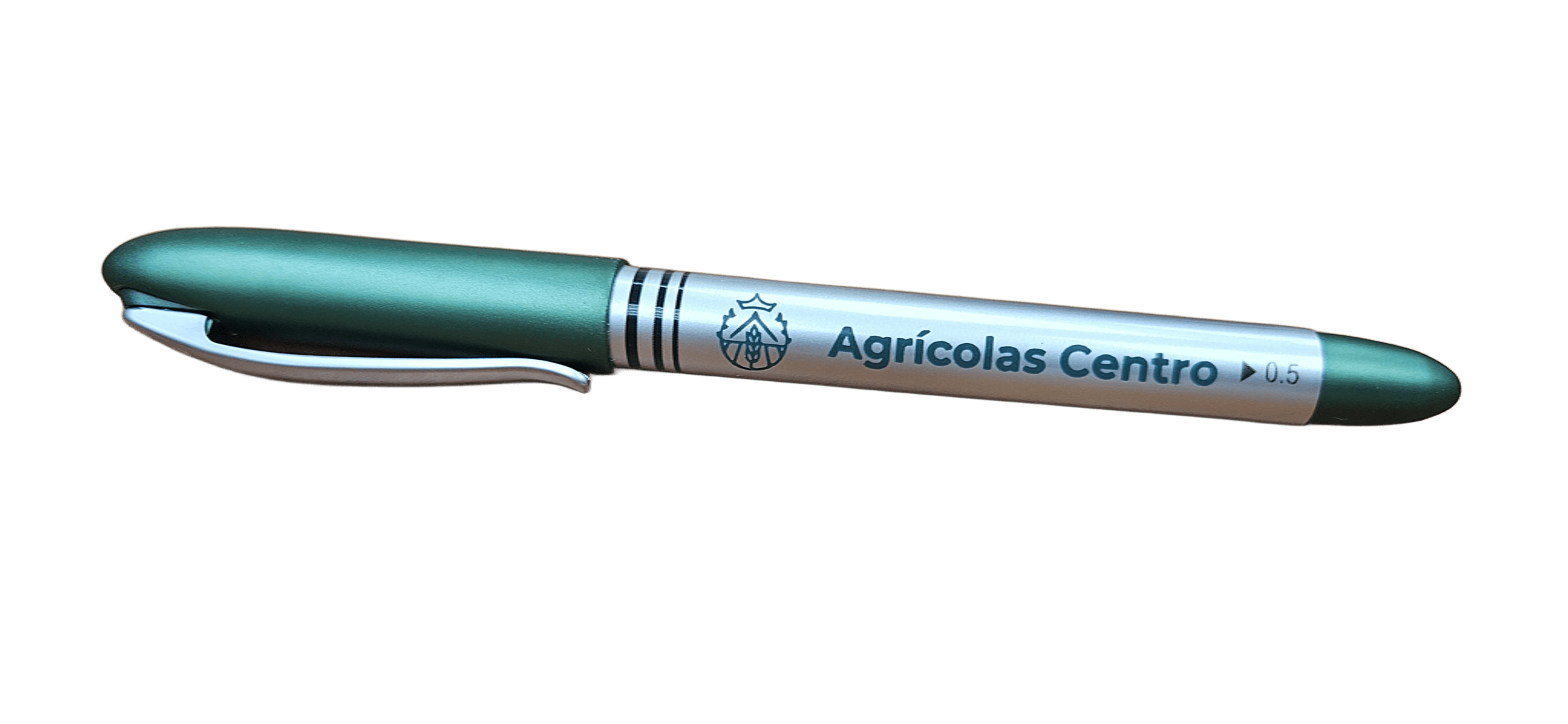 Bolígrafo roller 0´5 mm de tinta líquida azul y capucha verde con el escudo y nombre Colegio de Agrícolas Centro en verde.