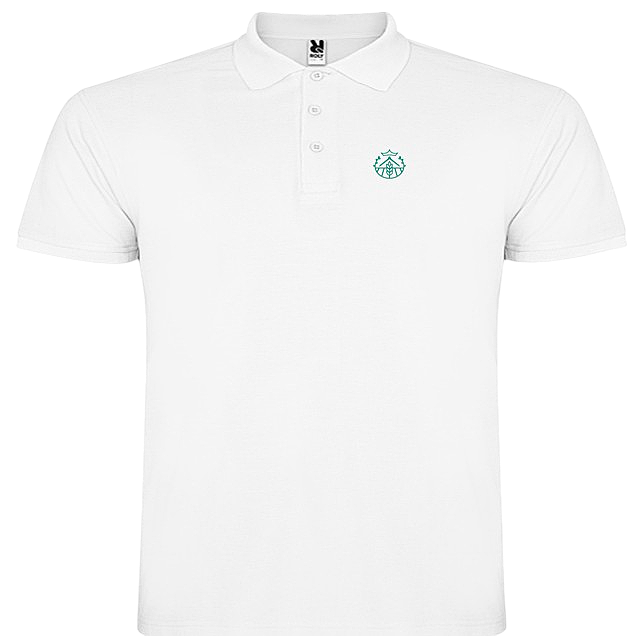 Polo de manga corta, blanco y elegante, con tapeta de tres botones, abierto en los laterales inferiores que lleva bordado el nuevo escudo del Colegio de Agrícolas del Centro en verde.